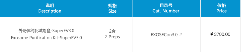 尺寸排阻色譜法(SizeExclusionChromatography,SEC)被認為是從不同樣 本中分離和純化 EVs 的最佳方法之一,因為它能夠快速而有效地將 EVs 從復(fù)雜 樣本中分離出來,并能保持 EVs 的原始形狀和生物學(xué)功能。我們開發(fā)了用于分 離 EVs 的不同類型的 SEC 柱:SuperEV0.5,SuperEV1.0 和 SuperEV3.0,適合 不同樣本和體積的 EVs 分離。針對獲得的餾分再通過 EVs 濃縮柱,基于凝膠樹 脂層析實現(xiàn)餾分的濃縮和進一步純化。此種組合得到的 EVs 不僅純度更高,優(yōu) 于超速離心,而且保持 EVs 的生物學(xué)功能,適合 EVs 蛋白質(zhì)質(zhì)譜分析,RNA 高 通量測序和 EVs 的體內(nèi)外細胞實驗等。另外,還可用于大量制備適合于臨床應(yīng) 用的 EVs 產(chǎn)品。