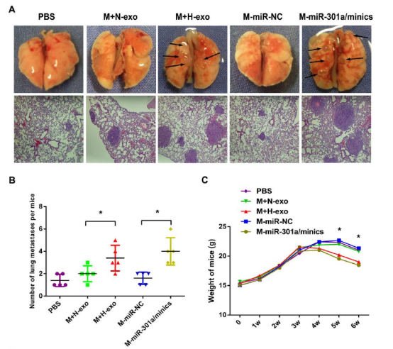 巨噬細胞是腫瘤內(nèi)和腫瘤周圍最豐富的浸潤性免疫相關(guān)基質(zhì)細胞,表現(xiàn)出不同的表型和功能。根據(jù)環(huán)境因素,巨噬細胞可以被極化為M1)或M2型細胞。M1巨噬細胞是以誘導(dǎo)型一氧化氮合酶(iNOS)表達為特征的促炎性巨噬細胞,而M2巨噬細胞表達高水平的抗炎細胞因子(例如IL-10)和有效的精氨酸酶-1(Arg1)活性,有利于腫瘤細胞的生長。 然而,巨噬細胞極化的機制在胰腺癌中仍然未知。 本研究發(fā)現(xiàn),來自胰腺癌細胞的缺氧外泌體以HIF-1a或HIF-2a依賴性方式激活巨噬細胞至M2表型,然后促進胰腺癌細胞的遷移、侵襲和EMT過程。外泌體已被證明能夠轉(zhuǎn)運很多miRNAs以改變細胞功能,同樣研究人員發(fā)現(xiàn)miR-301a-3p在缺氧胰腺癌細胞中高度表達,并富含缺氧胰腺癌細胞衍生的外泌體。循環(huán)外泌體miR-301a-3p水平與侵襲、淋巴結(jié)轉(zhuǎn)移、晚期TNM分期和胰腺癌不良預(yù)后呈正相關(guān)。缺氧下的外泌體miR-301a-3p通過激活PTEN /PI3Kγ信號傳導(dǎo)途徑誘導(dǎo)巨噬細胞的M2極化。胰腺癌細胞與其中miR-301a-3p被上調(diào),與低氧外泌體處理的巨噬細胞的共培養(yǎng)后能增強胰腺癌細胞轉(zhuǎn)移能力??偟膩碚f,這些數(shù)據(jù)表明胰腺癌細胞在缺氧微環(huán)境中產(chǎn)生富含miR-301a-3p的外泌體,然后極化巨噬細胞以促進胰腺癌細胞的惡性行為。因襲,靶向外泌體miR-301a-3p可為胰腺癌提供潛在的診斷和治療策略。